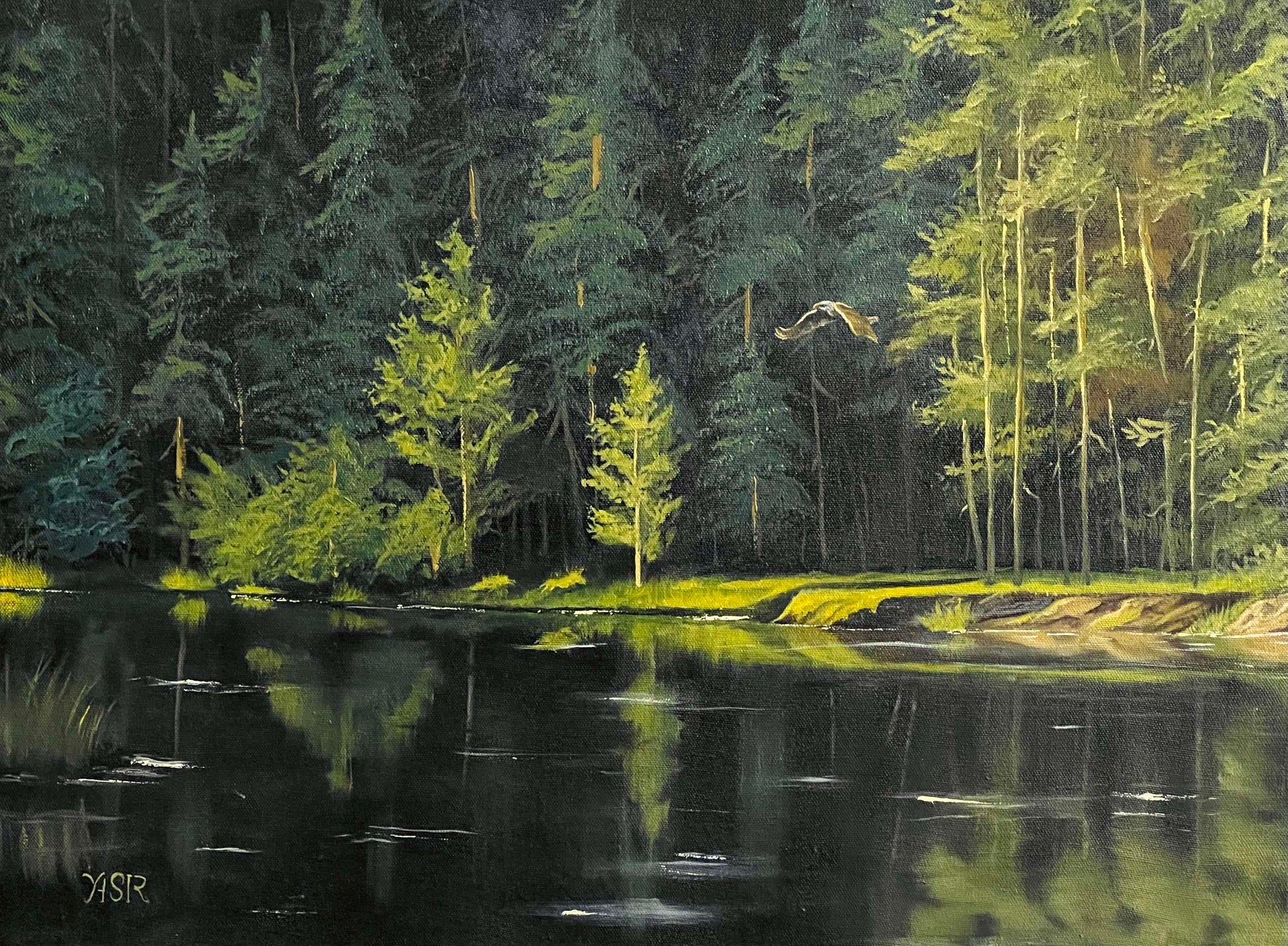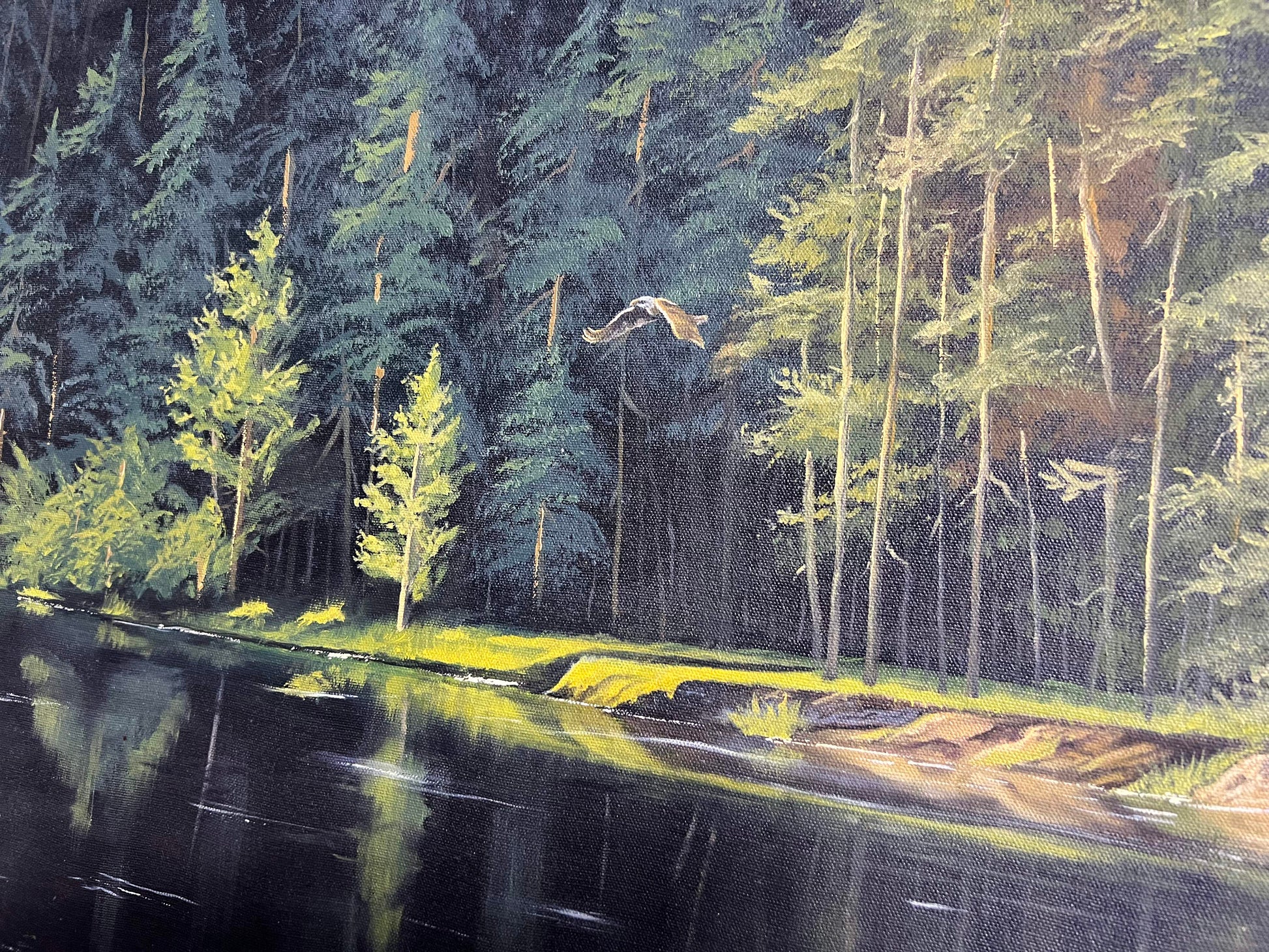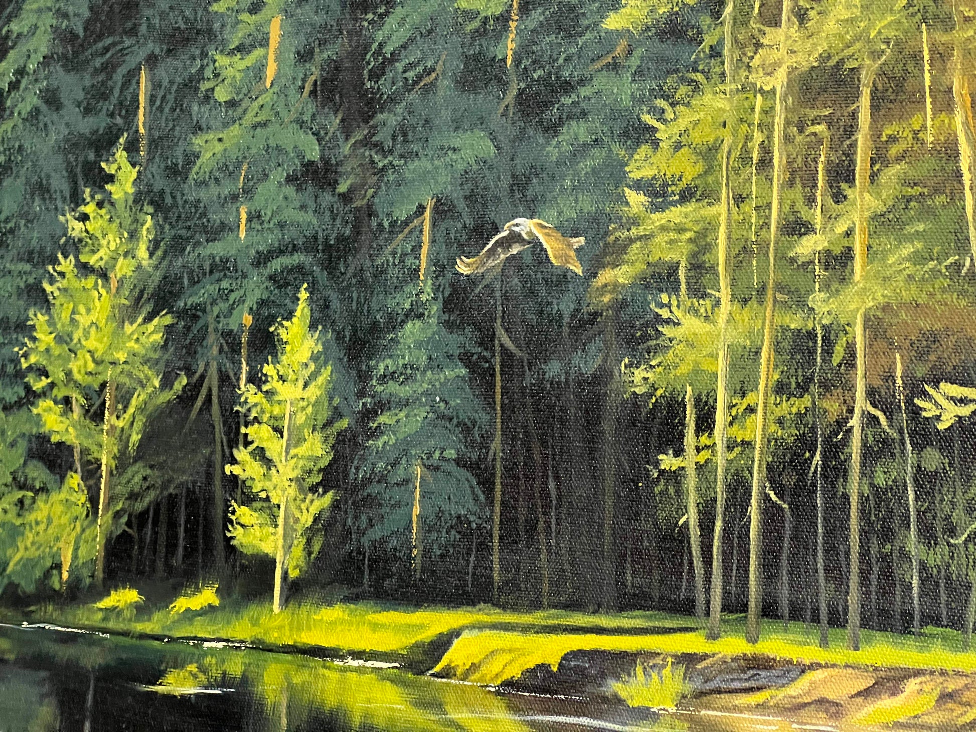 This captivating 24x18 inch painting brings nature to life with a stunning portrayal of a serene forest landscape. The composition is filled with rich, earthy tones, capturing the lush details of trees and foliage that create a peaceful, immersive atmosphere. In the distance, an American eagle soars gracefully from the treetops, embodying strength, freedom, and the untamed beauty of the wild. The flight of the eagle adds a dynamic element to the scene, symbolizing both independence and the unbreakable connection between the land and its creatures. This piece invites the viewer to pause and appreciate the quiet majesty of the natural world.