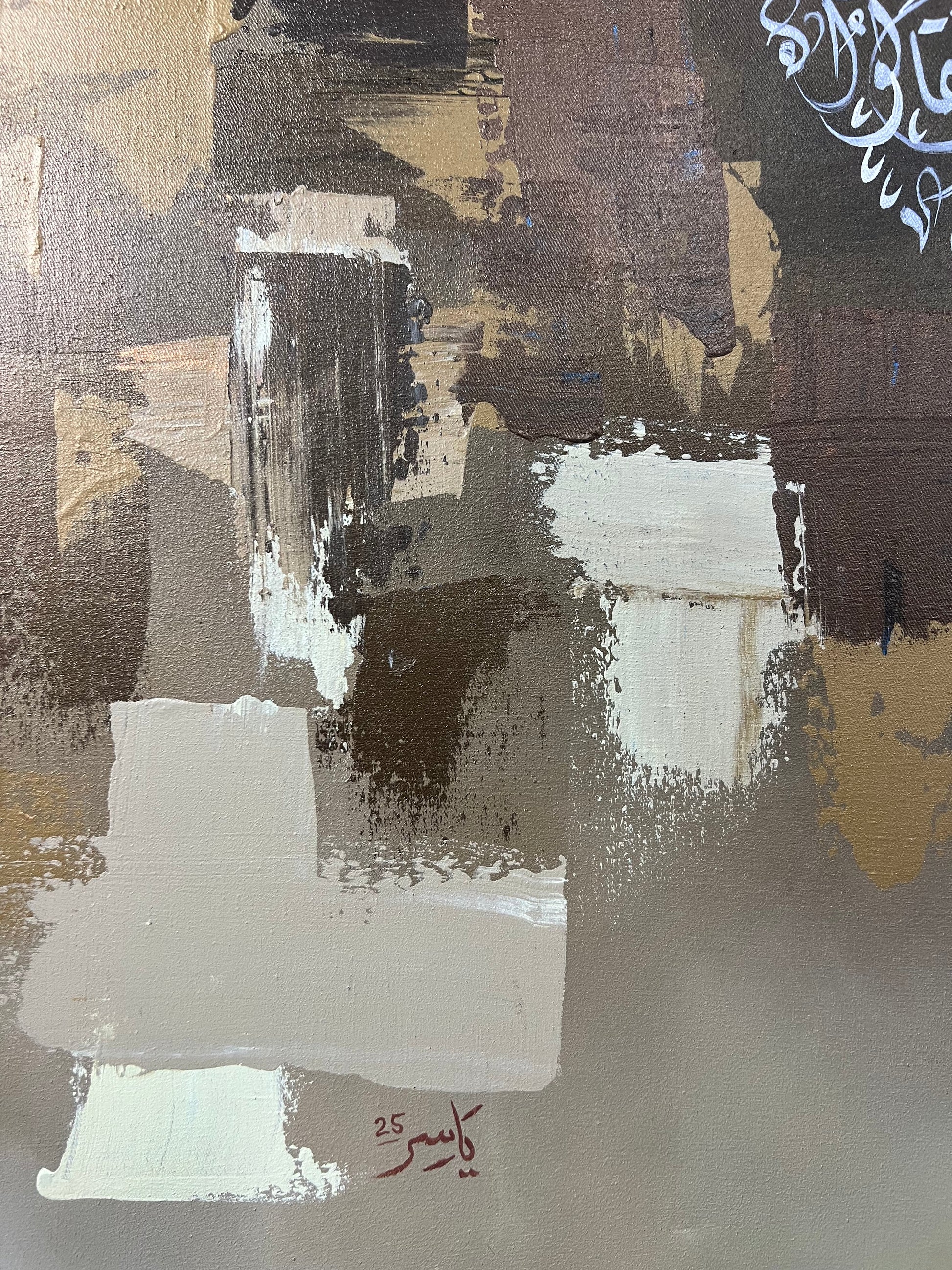 Immerse yourself in the beauty of sacred expression with this hand-painted modern abstract calligraphy artwork by Muhammad Yasir Azeemi, crafted in the graceful flow of Khat al-Diwani.
